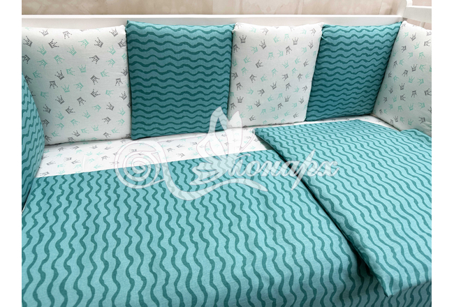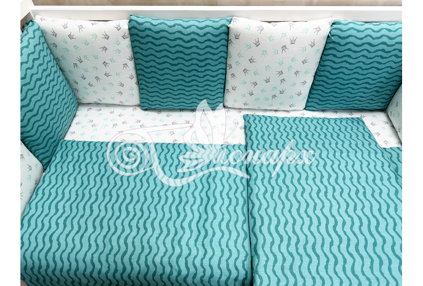 Бортик составной: 12 подушек 31х34 см на замочках упакованы в сумку-переноску.