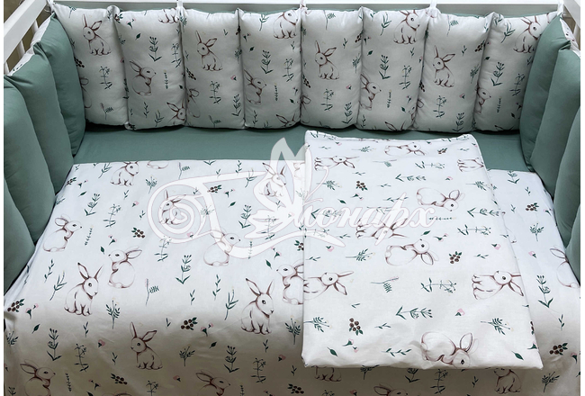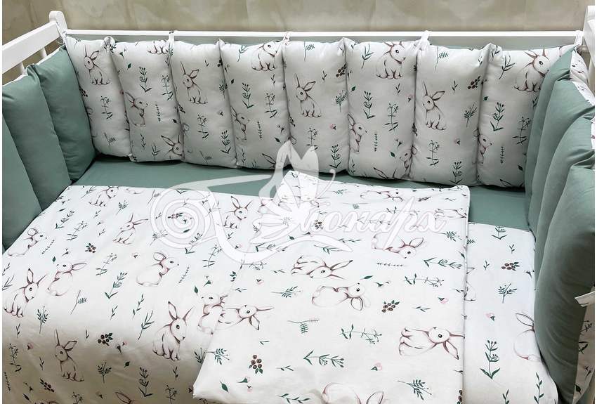 Бортики на замочках в кроватку: защитят Вашего малыша от ушибов, сквозняков, солнечных лучей и не дадут малышу запутаться в прутьях кроватки. - Подушка (100% хлопок- бязь) - 40х60 см.
