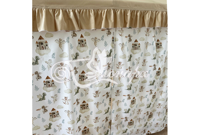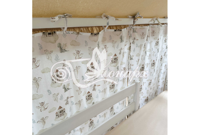 ширина - 137 см + 24 см на рюши (по 12 см на одну сторону). - Занавески с завязками (по 4 завязки на каждой занавеске) на переднюю сторону кроватки 2 шт.: