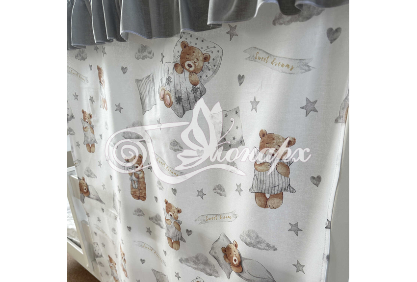 ширина - 137 см + 24 см на рюши (по 12 см на одну сторону). - Занавески с завязками (по 4 завязки на каждой занавеске) на переднюю сторону кроватки 2 шт.: